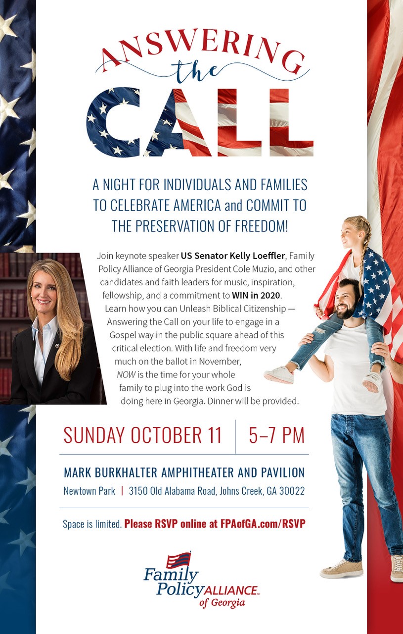 Already, we have confirmed Senator Kelly Loeffler as a speaker, and we’ll hear from other great pro-family officials, candidates, and leaders. Dinner is provided, and the whole event is FREE – though we will encourage donations to help fight for our values this November!